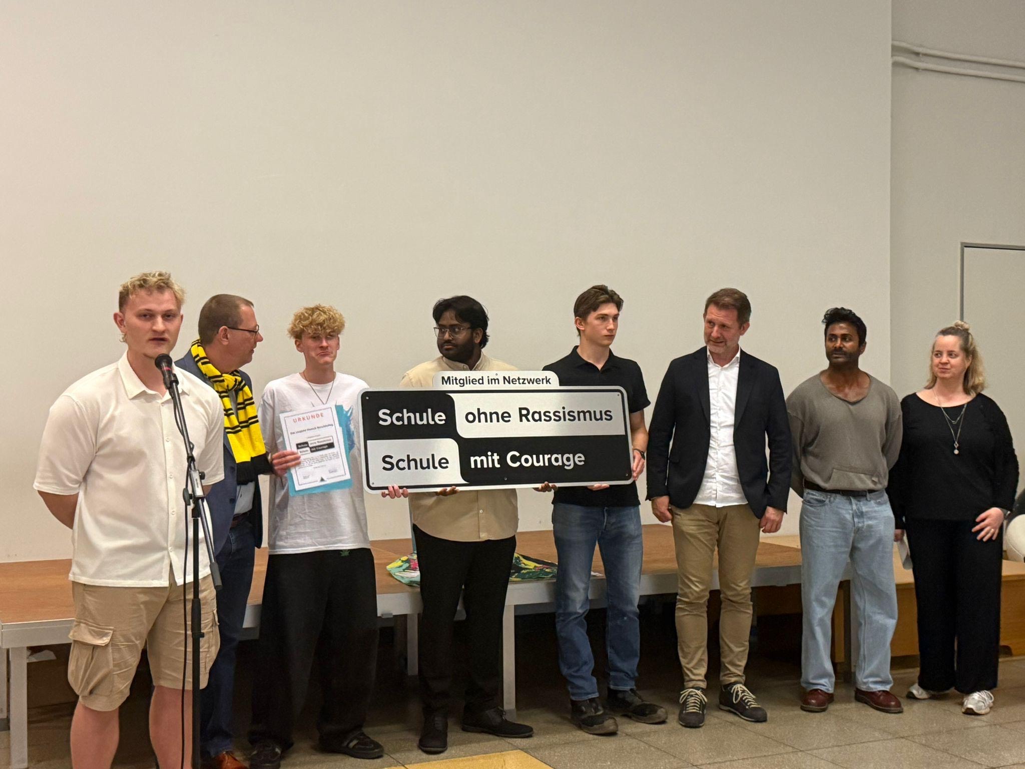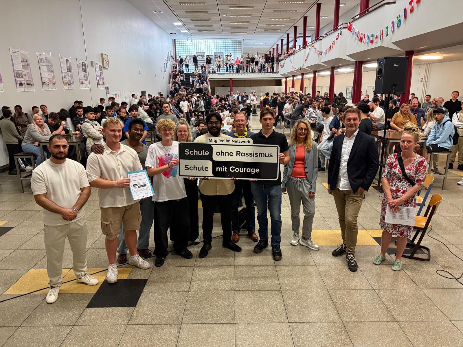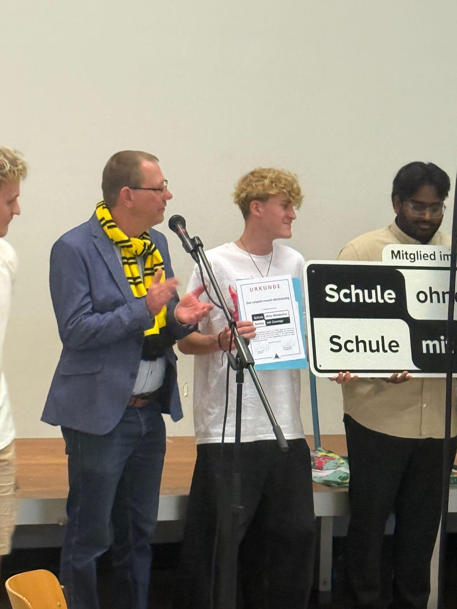 Vor allem die Worte des Schülersprechers berührten, der von einer nicht perfekten Schule, aber vom Einsatz und Willen der Gemeinschaft sprach. Christina Menne, Regionalkoordinatorin für das Courage-Netzwerk, überreichte die Urkunde und das Siegel an die Schüler Matz Piel, Aheeshan Vijeyarajah und Theo Neuwald.
